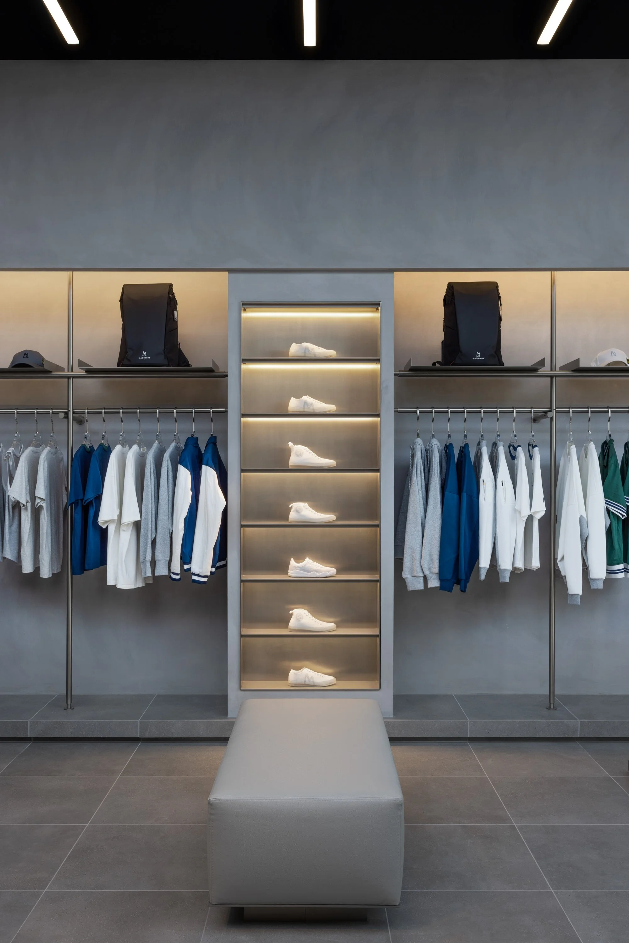 The material palette references the cityscape, with concrete and asphalt-inspired surfaces and illuminated graphics nodding to urban signage. Stainless-steel fixtures reinterpret scaffolding elements, while lighting by Within Light Studio echoes the rhythm of streetlights, creating a dynamic but inviting retail atmosphere.